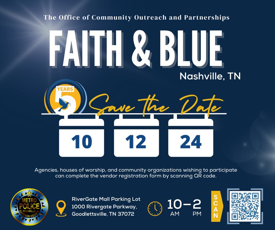 Faith & Blue is a nationwide initiative designed to create safer more inclusive communities by connecting law enforcement officers, local organizations, and the community members they serve. This is a free, family-friendly community event where you can share information and resources offered by your organization. There is no fee for vendors but all vendors must provide their own equipment (tent, table, chairs, etc.). You’re more than welcome to set up a booth or donating their time to provide drinks, food, face painting, arts & crafts station, diapers, hygiene kits, etc. We also are in need of a DJ. The set-up time will be 9:00am-10:00am with break-down from 2:00pm-3:00pm.