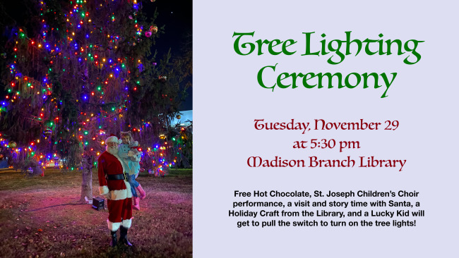 Tuesday, November 29, at the Madison Branch Library, we will enjoy free hot chocolate, a performance by the St. Joseph Children’s Choir, a visit and story time with Santa, a craft from the Library, and a lucky kid will get to pull the switch to light the tree for the season!