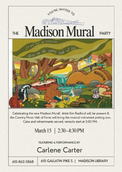 Celebrating the new Madison Mural! Artist Kim Radford will be present & the Country Music Hall of Fame will bring the musical instrument petting zoo.