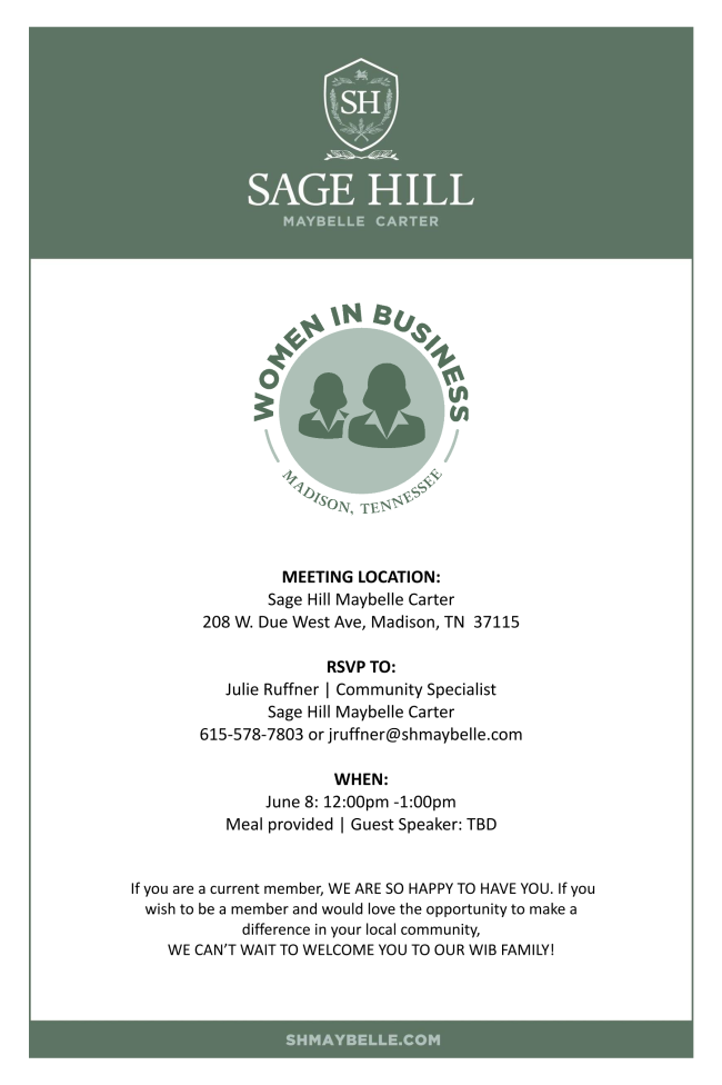 Join us June 8 at noon at Sage Hill Maybelle Carter (208 W Due West Ave in Madison) for a complimentary lunch.