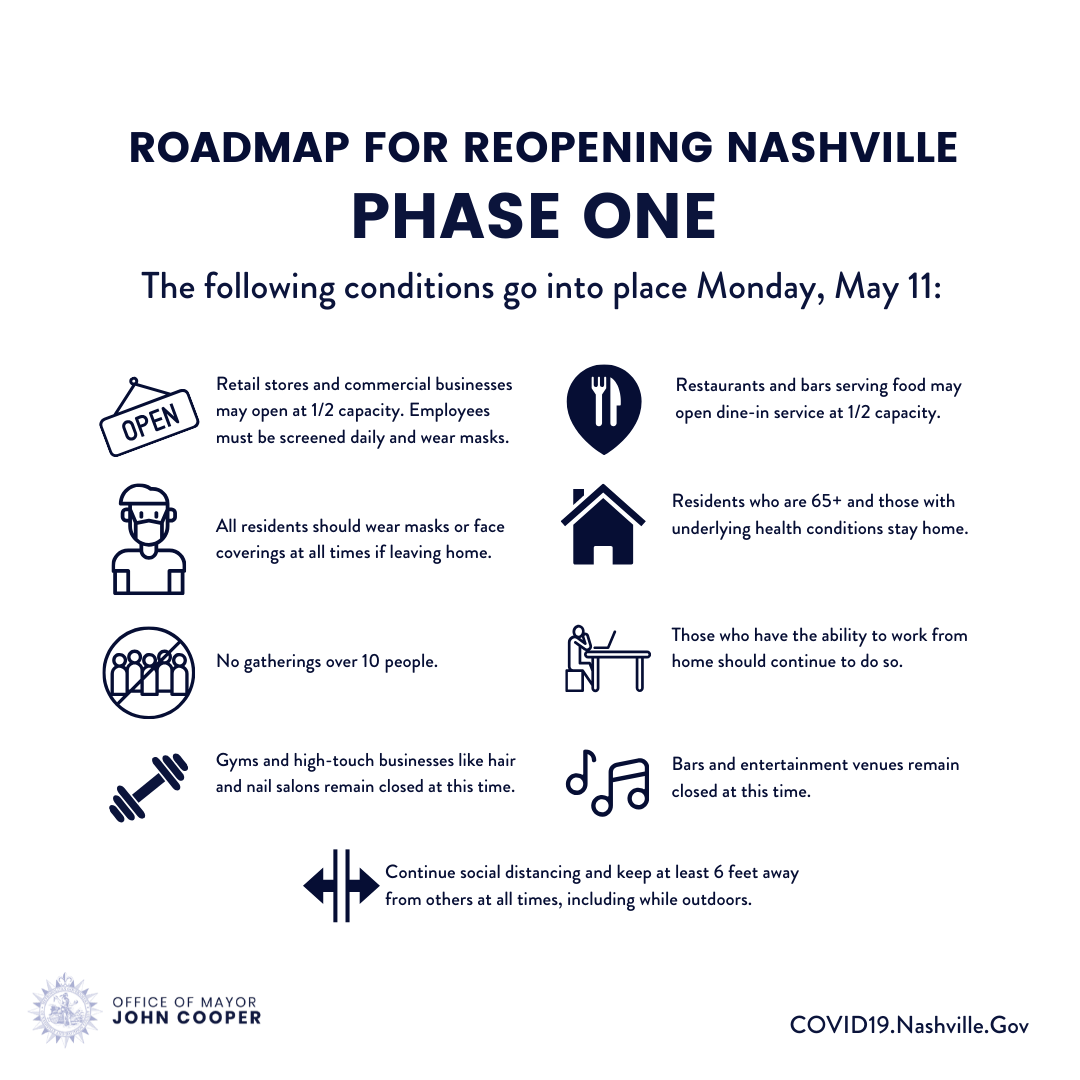 View Larger Image Phase One of the Metro Nashville Reopen plan Phase One of the Metro Nashville Reopen plan begins tomorrow. See the details about this phase in the image above. MADCHAadm2020-05-21T10:15:34-05:00May 10th, 2020|News| Share this story with friends and colleagues! FacebookXRedditLinkedInTumblrPinterestEmail Related Posts Community Closures for CoronaVirus- FiftyForward Closed Through April 2 Best of Madison-Rivergate Awards for 2020! Ribbon Cutting – Congratulations & Welcome to Jennifer Bourne of State Farm! Time for the Best of Madison 2020 Nominations! Madison-Rivergate Chamber Annual Banquet